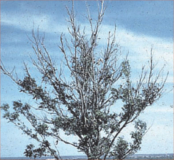 Substantial dieback of branches in the upper canopy. Examination revealed the presence of many small galls and egg masses on feeder roots-with female nematodes often protruding from root tissue. The worms were identified as root-knot nematodes, Meloidogyne partityla. Host range tests conducted in Texas, revealed that it prefers to feed on hickory, pecan, and walnut trees. Although M. partityla is not likely to kill the pecan trees, it will debilitate them and lower their productivity to a point where the orchard may no longer be profitable.
